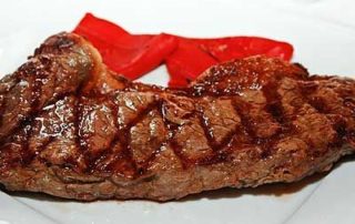 Chuletón de Buey con patatas asadas y pimientos fritos o asados.